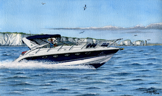 A4 Watercolour of a Fairline Targa 40 speeding past Ballard Down towards Old Harry Rocks.